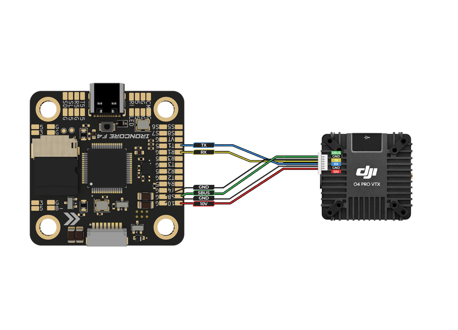 Connect the flight controller to the ESC using the provided multi-wire connector. This link carries throttle signals, telemetry, and power (if supported), ensuring clean and reliable communication between the FC and ESC. Note: Ensure correct connector orientation and secure fit before powering the system.