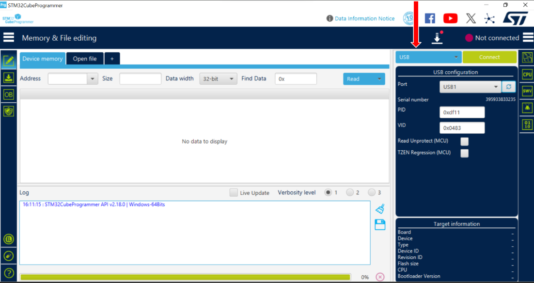 In the software, select USB from the interface dropdown menu on the right.
