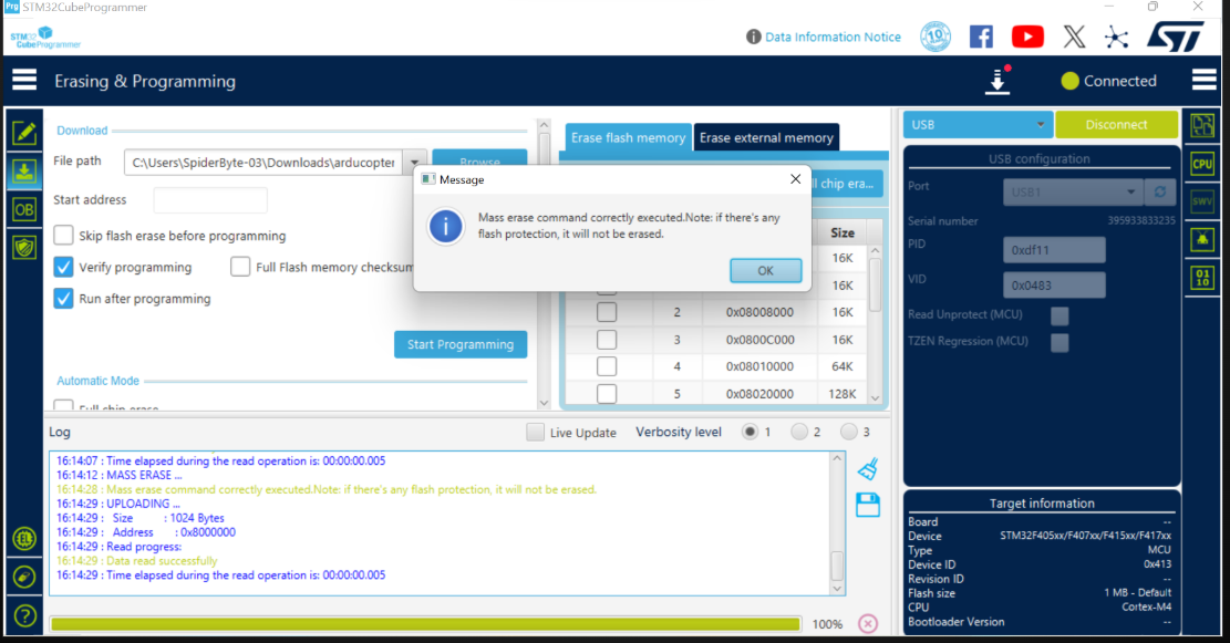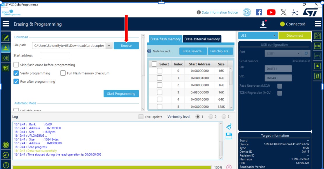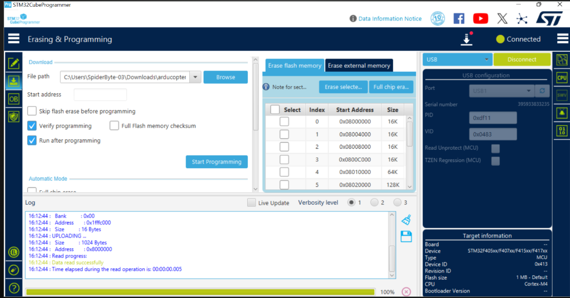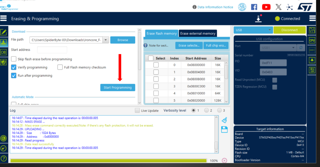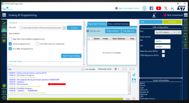 Once the file path is loaded, click the Start Programming button. Monitor the progress bar at the bottom and wait for the File download complete message before disconnecting your flight controller.