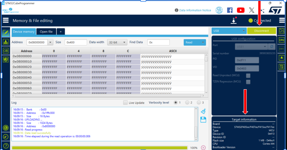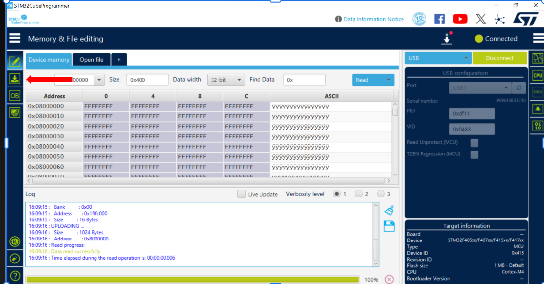 Once connected, click on the second icon in the left-hand sidebar menu (the green arrow icon) to open the Erasing & Programming section.