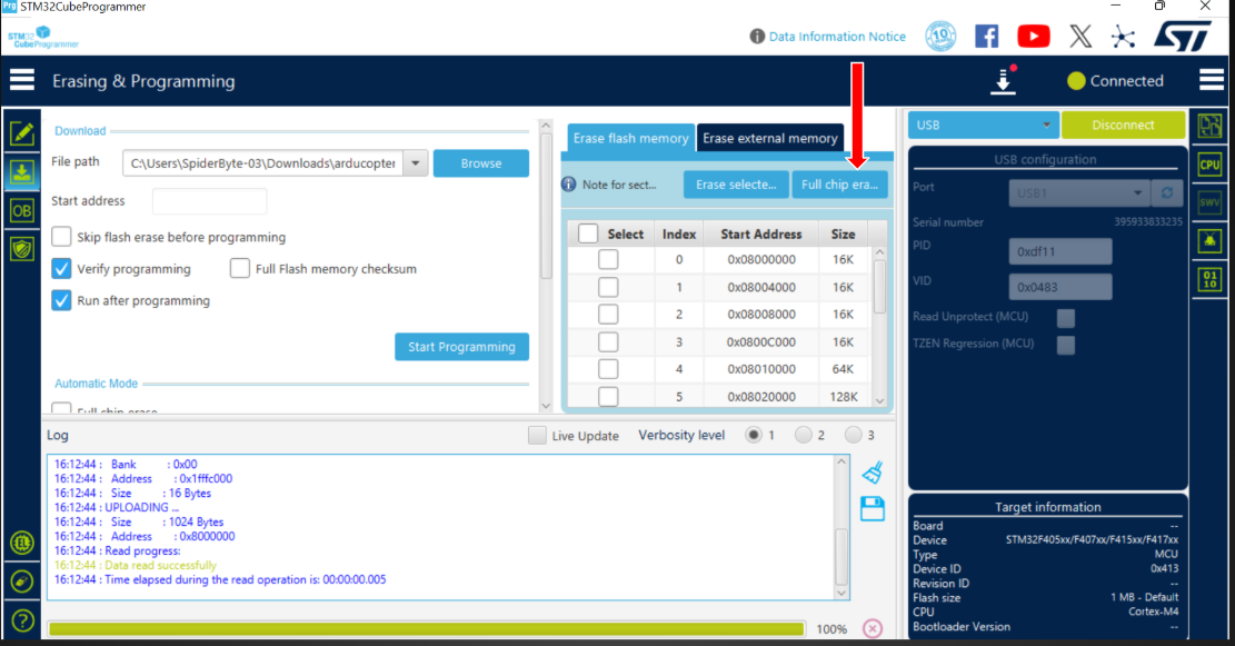 Before flashing new firmware, it is critical to wipe the existing data. Click Full chip erase and wait for the confirmation log to appear. Do not disconnect the device during this process.