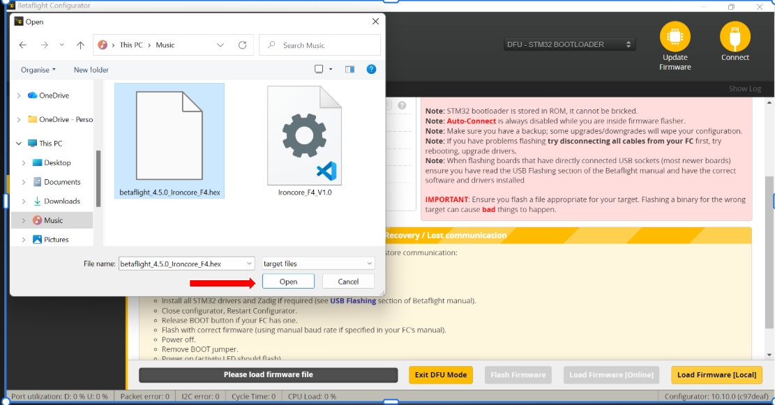 Now select the betaflight firmware which you downloaded (please find the link below to download the betaflight firmware) and click on open.